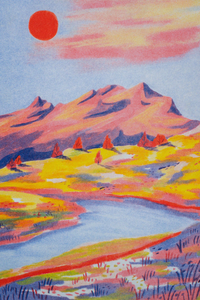 The unique riso printing process gives this piece its own character, with subtle variations in texture and color that make each print truly one of a kind.